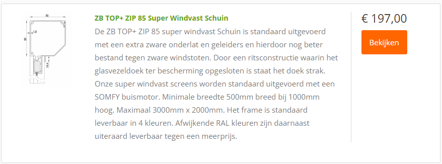 ZIP TOP Screens zijn geschikt voor woningen en bedrijven die meer last hebben van wind. Ze zijn voorzien van sterkere en zwaardere materialen dan standaard screens en hierdoor ook beter bestand tegen zwaardere weertypen.